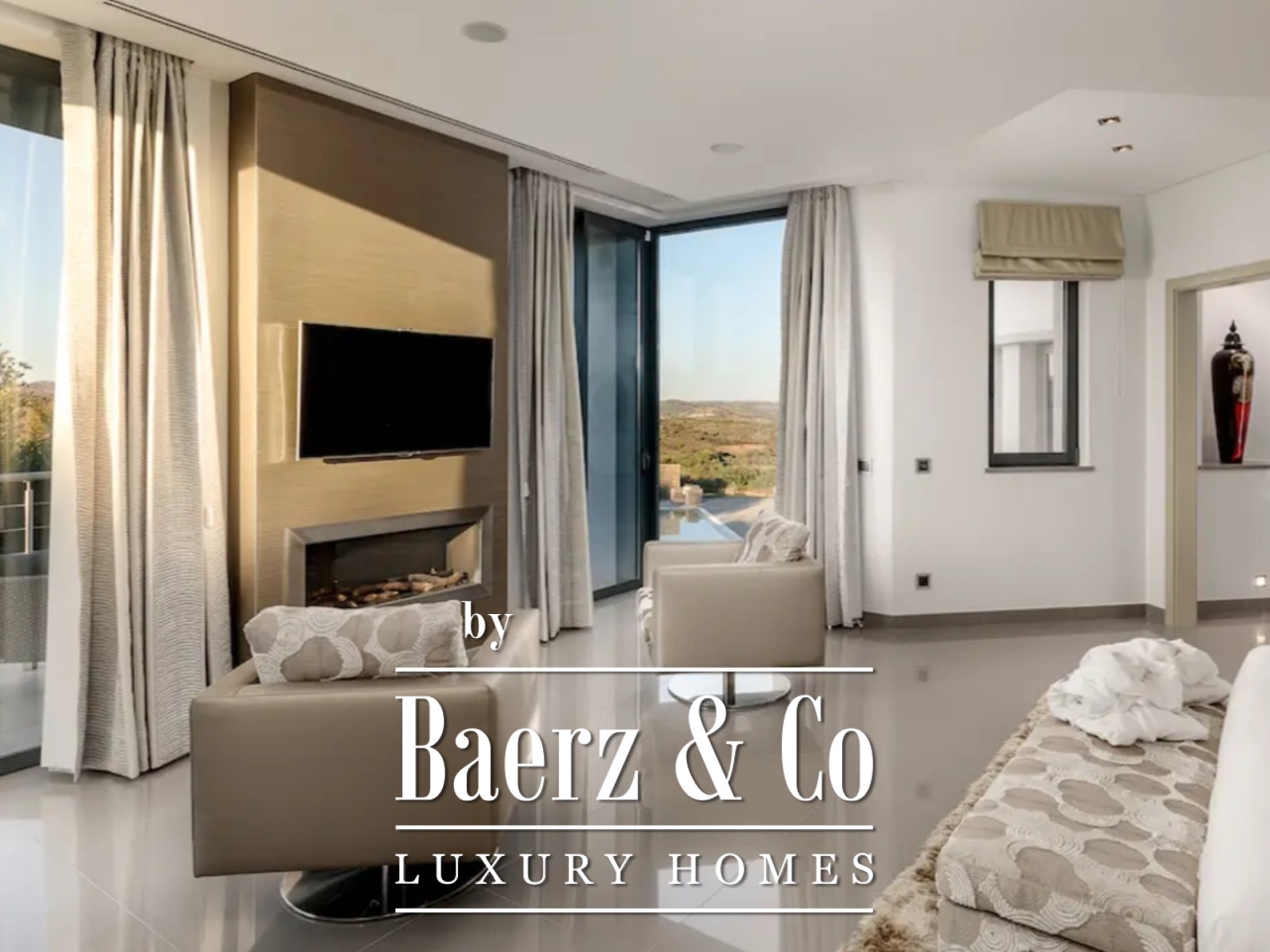 De mastersuite van ruim 70 m² beschikt over dubbele inloopkasten en een luxueuze badkamer, waarbij elk raam uitzicht biedt op de groene golfbaan. Op de eerste verdieping bevinden zich drie slaapkamers met eigen badkamer, naast een panoramische lounge en terras van 75 m², ideaal voor besloten bijeenkomsten of momenten van rust.