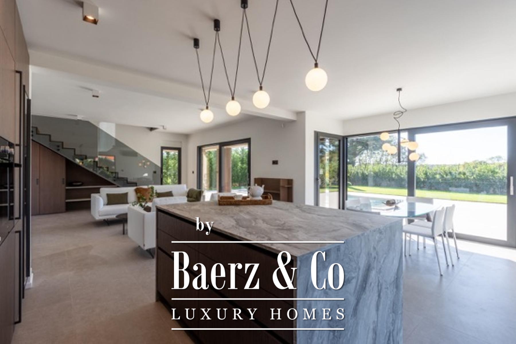Bij binnenkomst vallen de hoge plafonds en het open leefconcept direct op, waardoor er een gevoel van ruimte en licht ontstaat. Vloer-tot-plafond beglazing biedt uitzicht op een fraai aangelegde tuin en een verwarmd zwembad van 9,5 bij 3,5 meter. Het hoofdverdieping sluit naadloos aan op het buitenleven, waar automatische beregening het serene karakter van de binnentuin behoudt. In het hart van de woning leidt een glazen trap naar drie slaapkamers, elk voorzien van een moderne eigen badkamer. Twee van de slaapkamers openen naar privéterrassen die een rustige sfeer creëren voor ontspanning aan het eind van de dag.