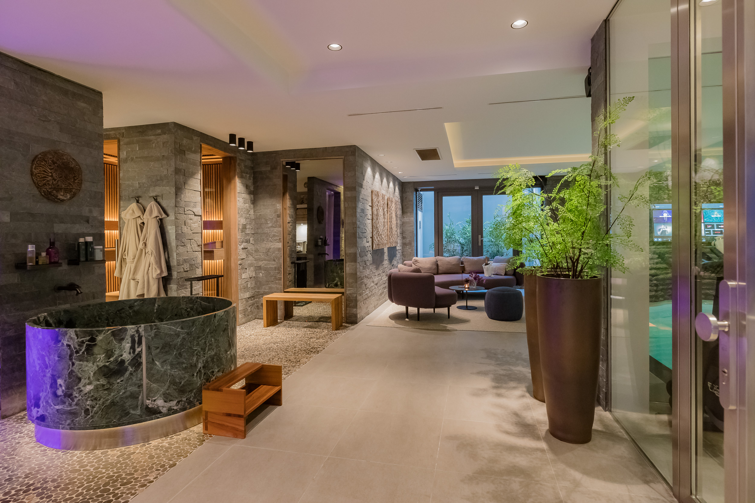 Het verwarmde binnenzwembad van 13 meter vormt het hart van deze verdieping – omgeven door wanden die golven als een berglandschap, met een subtiel verlichte waterval als blikvanger.