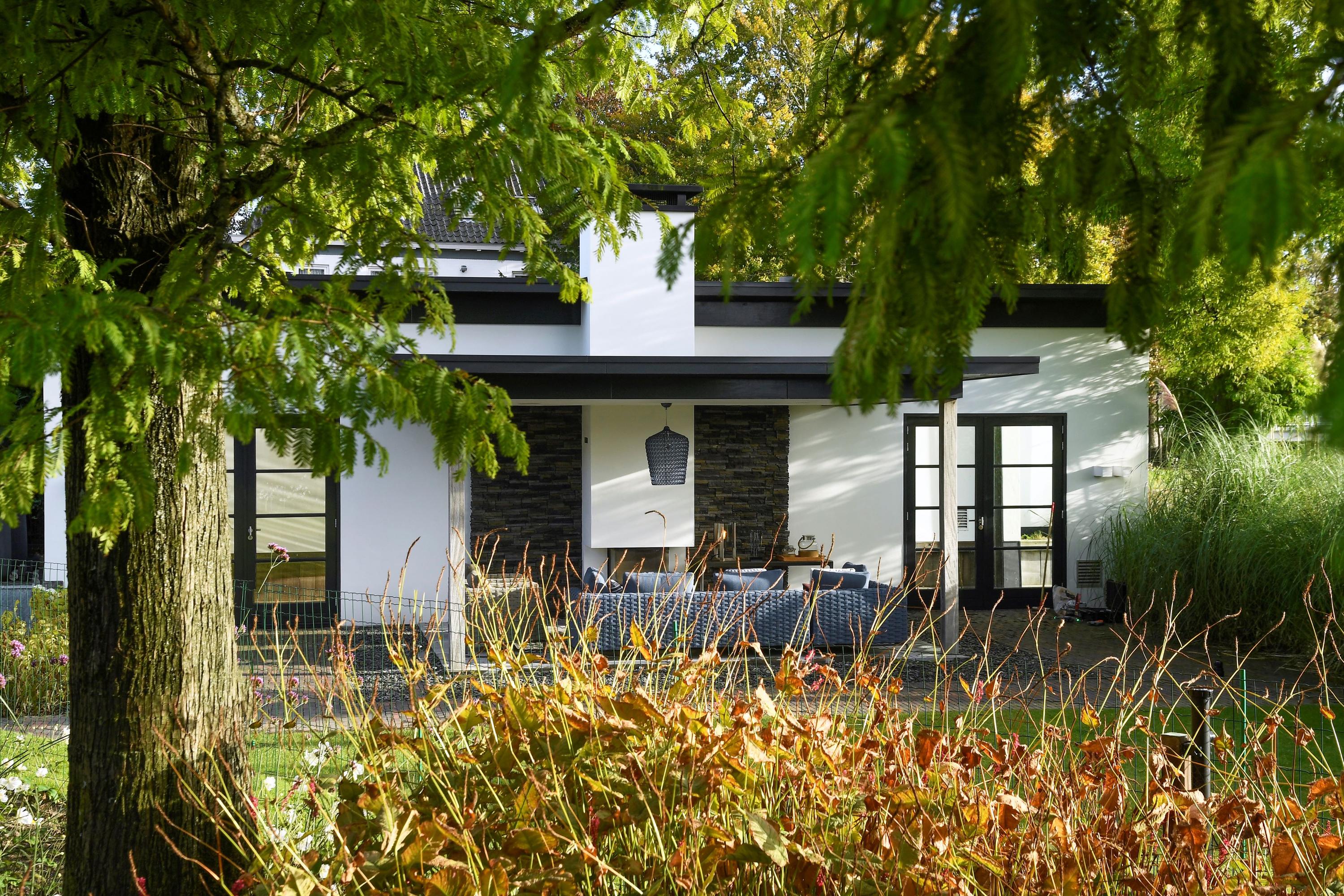 Hoge raampartijen en openslaande deuren zorgen voor een naadloze overgang tussen binnen en buiten.