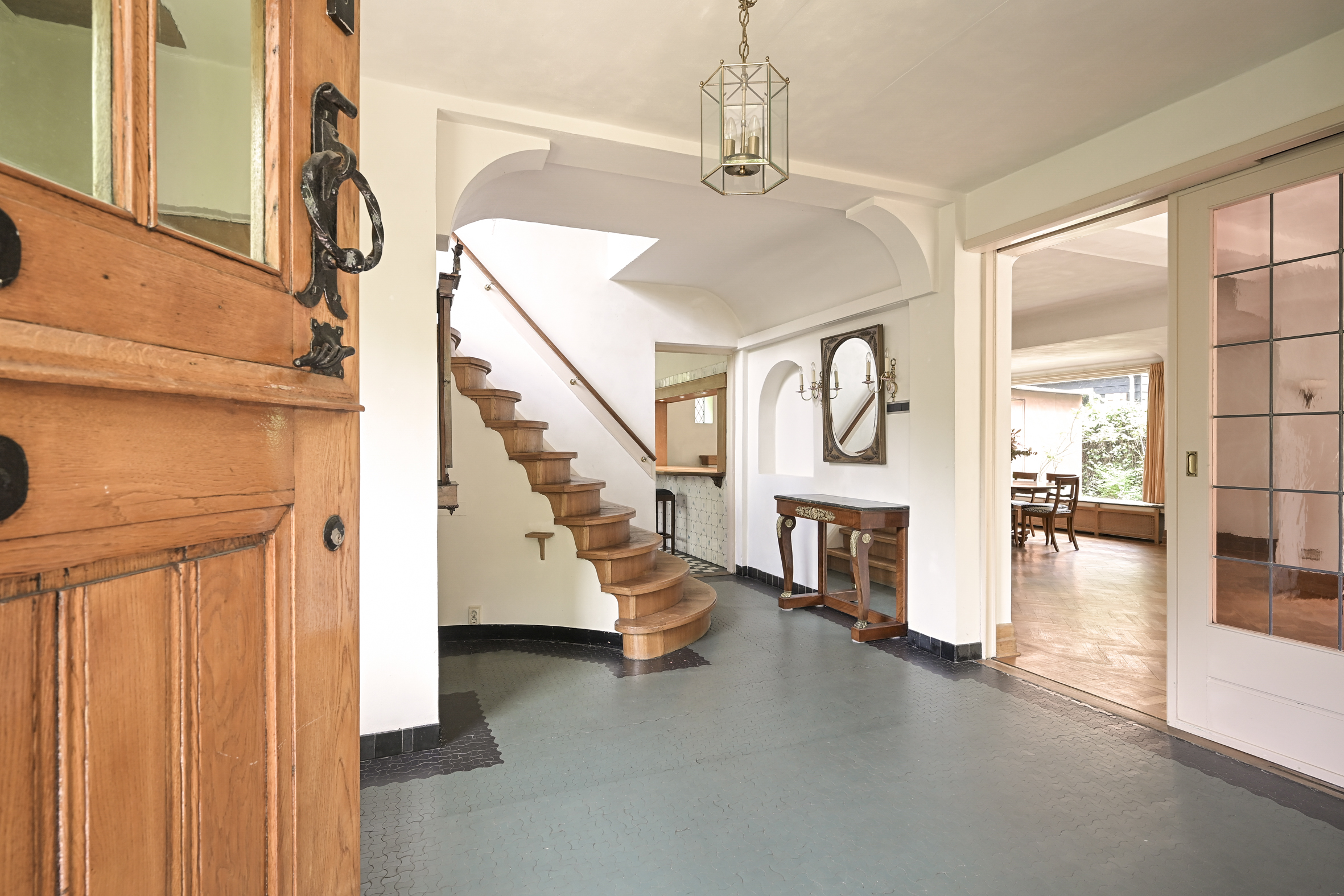 Indeling: entree, royale ontvangsthal met fraaie in mozaïek gelegde vloer, riant trappenhuis, eenvoudige wc met fonteintje. Dubbele schuifdeuren met glas in lood ramen naar ruime lichte zit/eetkamer met eiken parketvloeren, open haard, marmeren vensterbanken en toegang tot de zonnige tuin. Vanuit de centrale hal is de ruime nette keuken bereikbaar die middels een halfopen verbinding in contact met eetkamer staat. De keuken heeft een achter entree en heeft een aangrenzende bijkeuken met toegang tot de kelder die uit drie praktische ruimtes bestaat.