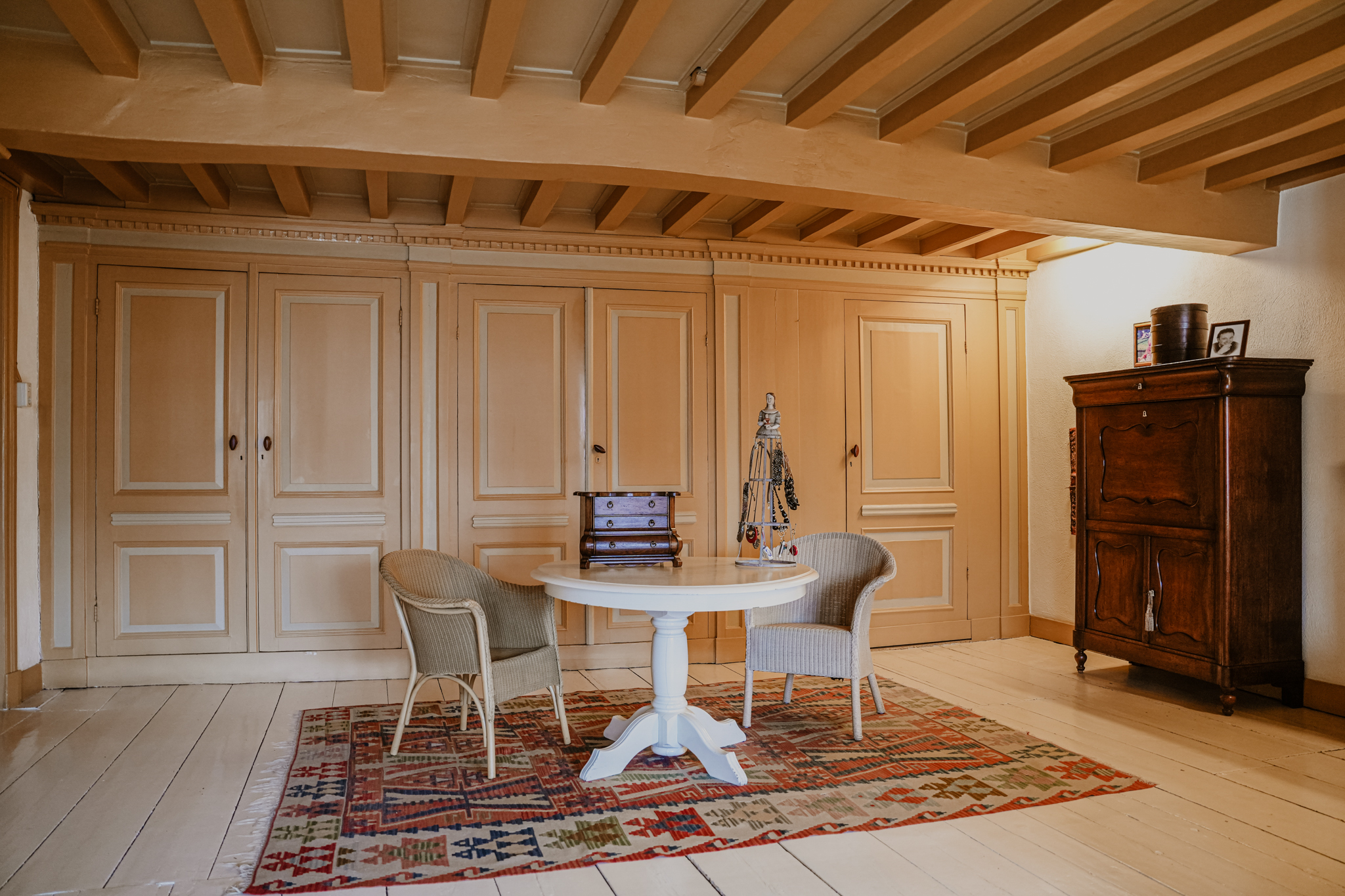 Overloop; logeerkamer in het hoofdhuis en een werkkamer boven de keuken op de tussenverdieping