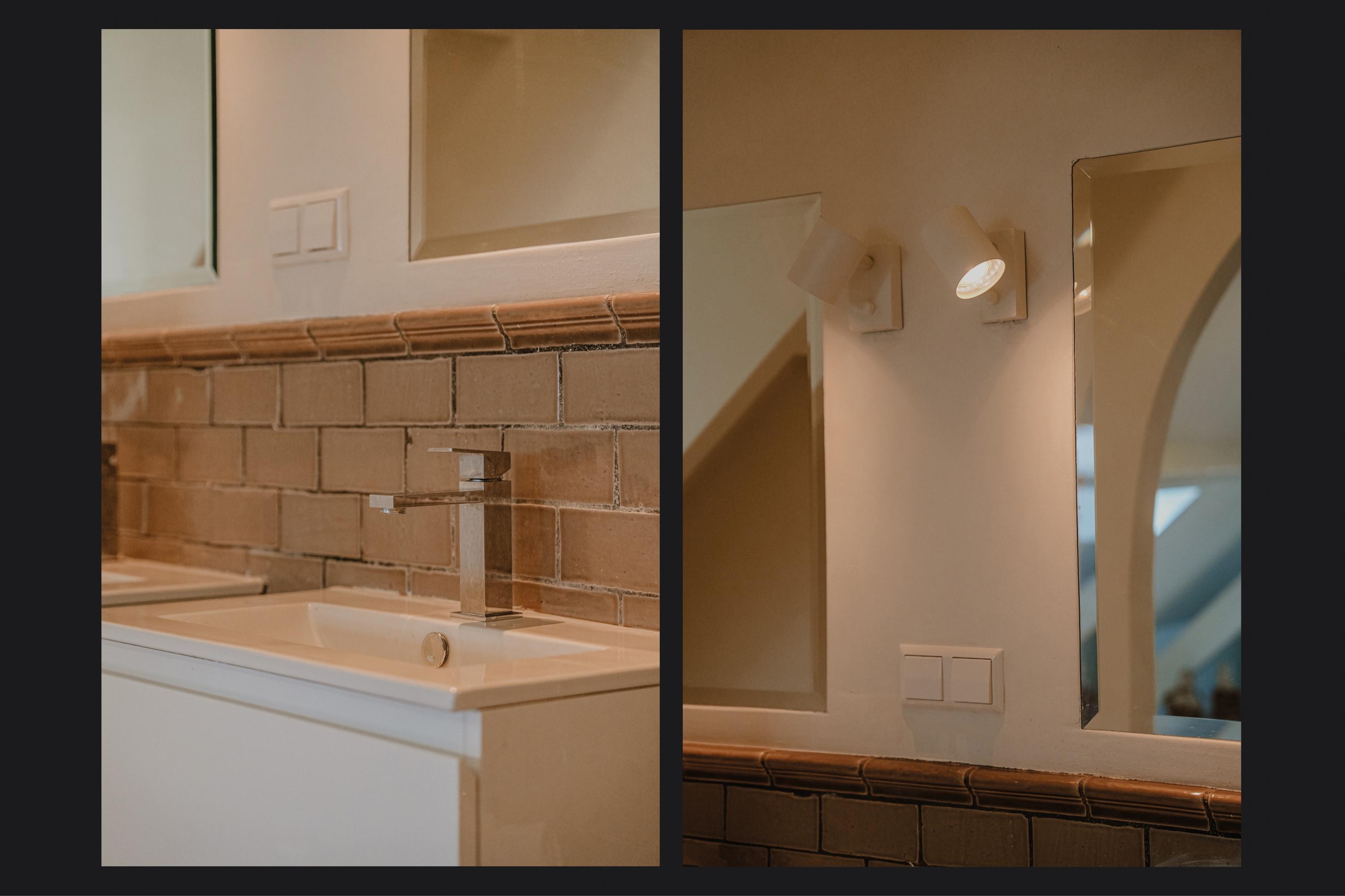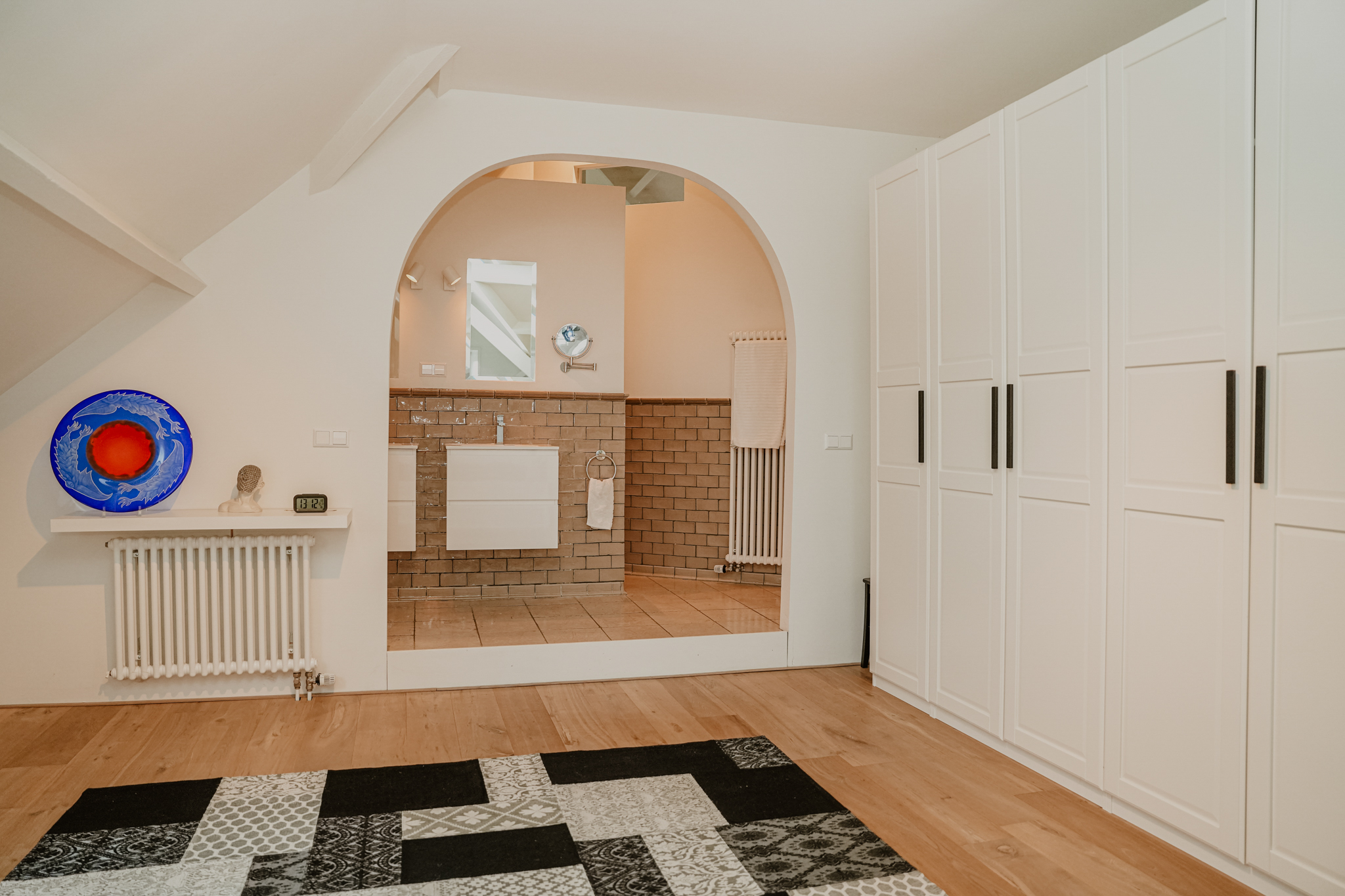 Op de verdieping liggen prachtige eiken vloerdelen. Aan de westzijde van het oorspronkelijke dijkhuis bevindt zich een riante slaapkamer met kleedkamer en de 2e badkamer. Deze badkamer is speels ingedeeld met een inloopdouche, toilet en dubbele wastafel en heeft een natuurstenen vloer.