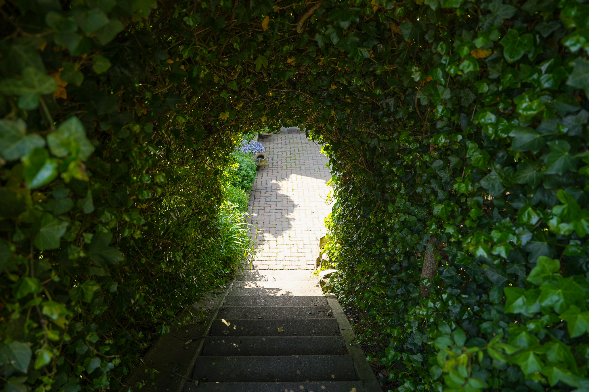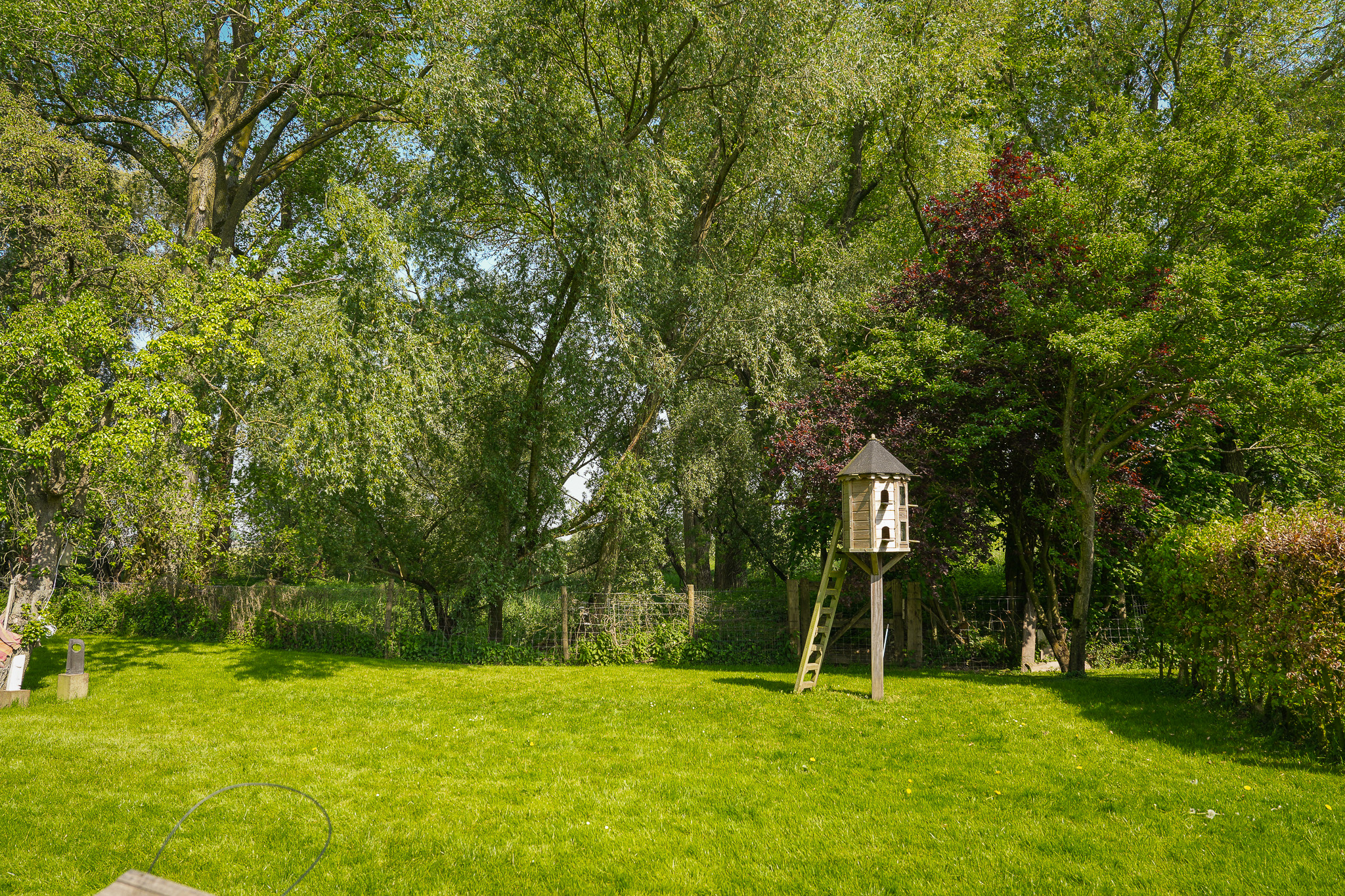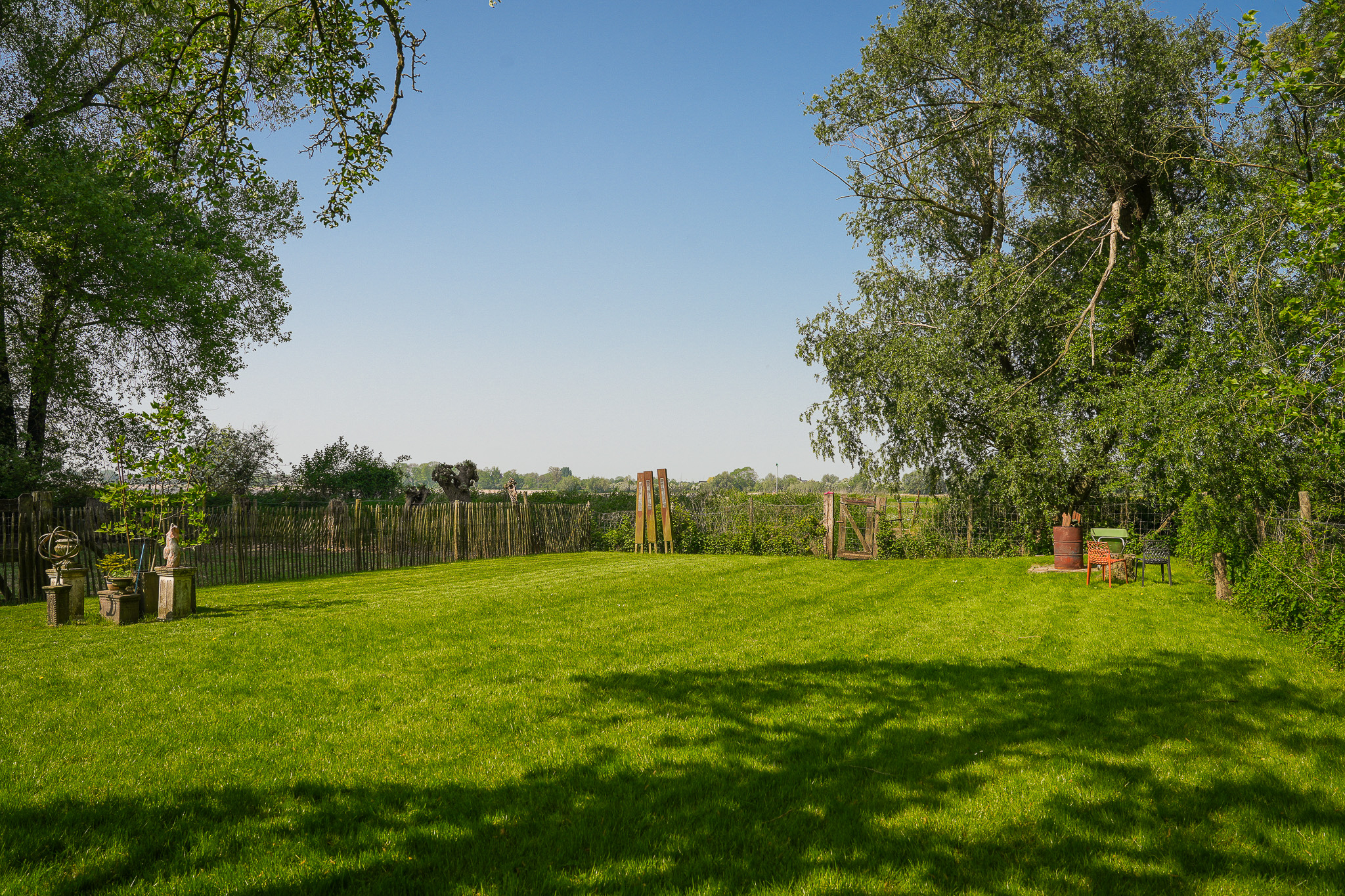 De tuin met diverse terrassen, houtopslag, mooie beukenhagen en een oude hoogstam fruitboom heeft een beplanting die bestand is tegen een hoge waterstand van de rivier mocht zich dit in de winter voordoen.